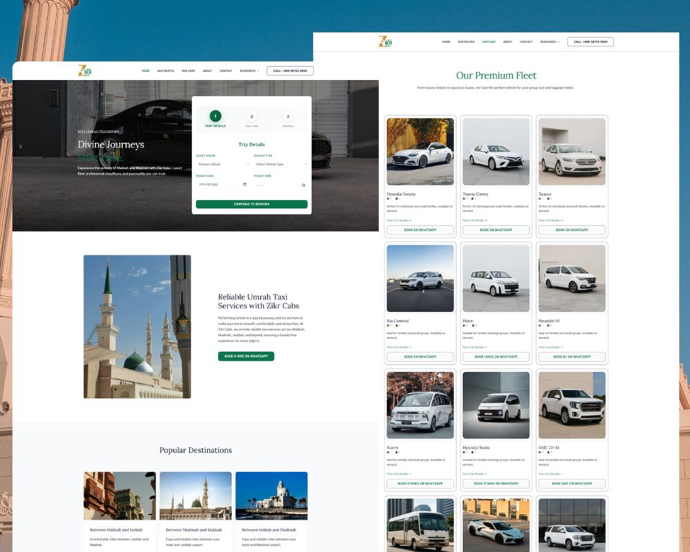 Zikr Cabs provides taxi services for Umrah pilgrims traveling between airports, hotels, and the holy cities of Makkah and Madinah. While their service was reliable and spiritually aligned, they lacked a strong online presence that reflected their mission and made booking simple for pilgrims from around the world.